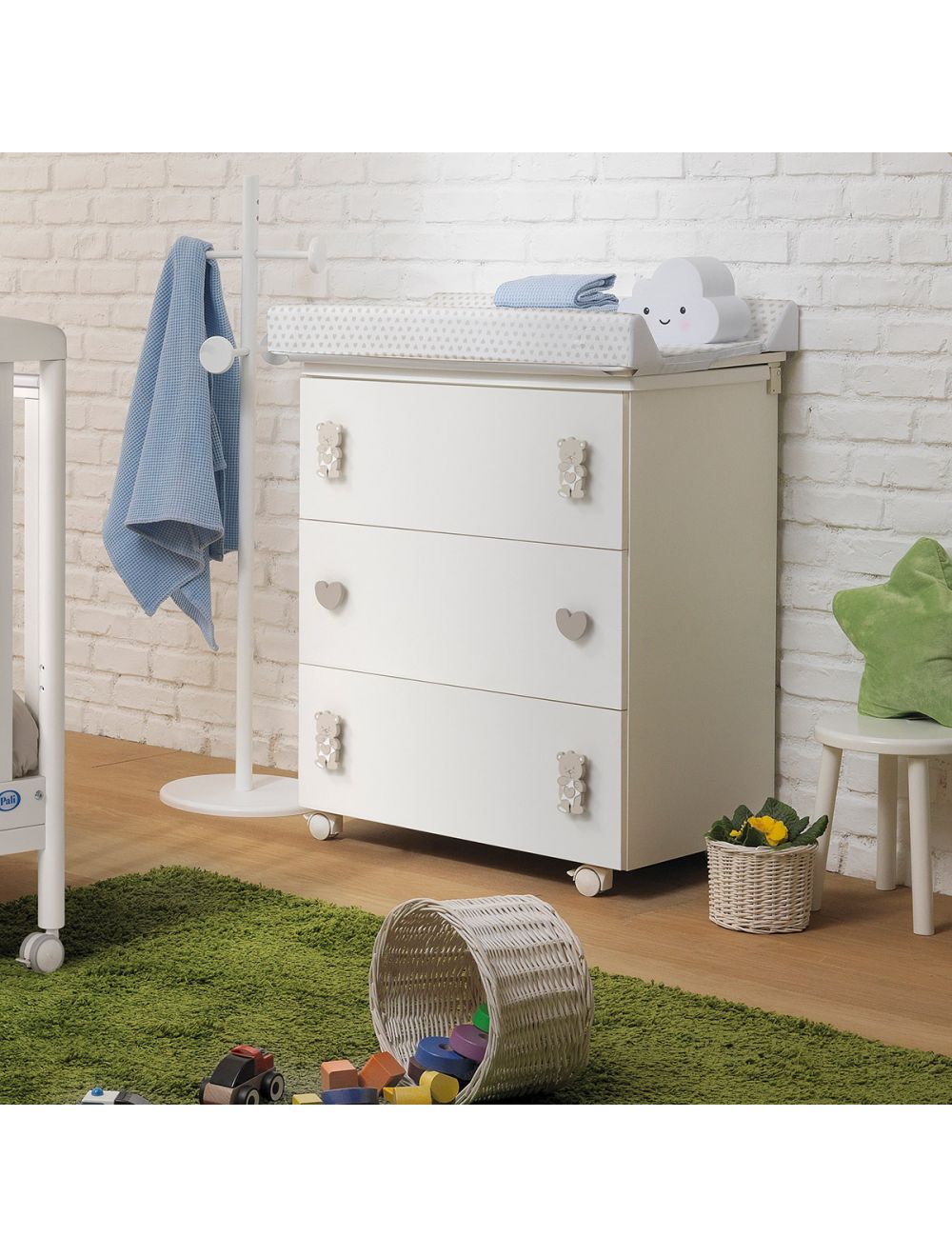 Die Wickelkommode Lovelette ist mehr als nur ein Möbelstück – sie ist ein stilvoller Helfer im Alltag junger Familien. Mit ihren liebevollen Details, wie den niedlichen Knäufen in Bären- und Herzform, bietet sie nicht nur praktischen Stauraum, sondern auch ein herzliches, kindgerechtes Design für das Babyzimmer.