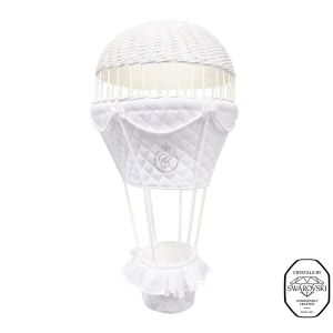 Die Lampe ist in der Form eines Heißluftballons gestaltet und besteht aus handgeflochtenem, weiß lackiertem Rattan in Kombination mit edlem, gestepptem Veloursstoff. Der Lampenkorb wird von einer zarten, transparenten Rüsche umrahmt und mit echten Swarovski® Kristallen verziert, die das Licht auf besonders elegante Weise reflektieren.