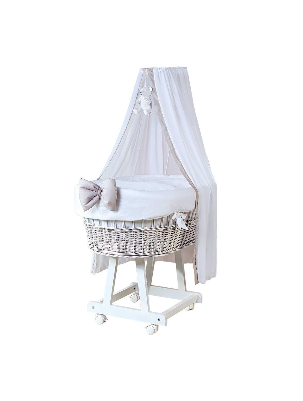 Der Stubenwagen ist vollständig ausgestattet und bietet Neugeborenen einen geschützten, gemütlichen Schlafplatz. Zur Grundausstattung gehören eine passende Matratze, textile Innenausstattung sowie ein spitzer Himmel mit langem Schleier. Der Himmel wird über eine Stangenhalterung direkt am Wagen befestigt und reicht nahezu bis zum Boden. Ein dezentes Teddydetail an der Spitze des Himmels setzt einen liebevollen Akzent, ohne aufdringlich zu wirken.
